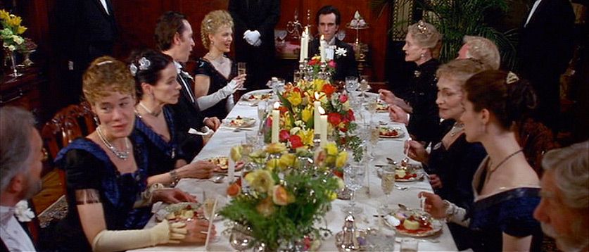 Cast: Daniel Day-Lewis (Newland Archer), Michelle Pfeiffer (Countess Ellen Olenska), Winona Ryder (May Welland), Miriam Margolyes (Mrs Mingott), Geraldine Chaplin (Mrs Welland), Michael Gough (Henry van der Luyden), Richard E. Grant (Larry Lefferts), Mary Beth Hurt (Regina Beaufort), Robert Sean Leonard (Ted Archer), Norman Lloyd (Mr Letterblair), Alec McCowen (Sillerton Jackson), Sian Phillips (Mrs Archer), Jonathan Pryce (Rivière), Alexis Smith (Louisa van der Luyden), Stuart Wilson (Julius Beaufort), Joanne Woodward (Narrator), Carolyn Farina (Janey Archer)