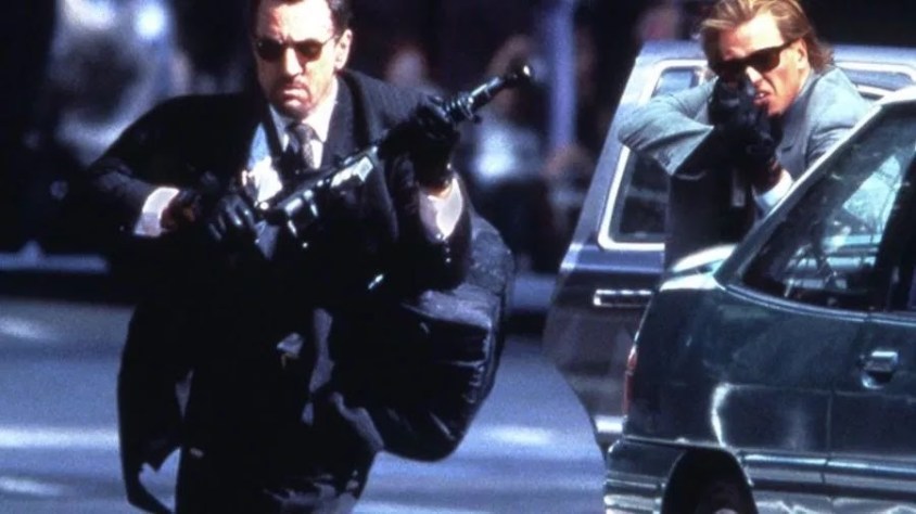 It’s also the one scene of the film that Pacino underplays in. The rest of the film he goes way bigger, powering through each scene with an explosion of shouting and drama. It’s a performance ripe for parody, with more than an edge of ham, but it just about works. Pacino turns Hanna (hilariously the character shares a name with a BBC political journalist of the 1980s) into the purest form of adrenalin junkie, a larger-than-life personality who tears through people and cases with a focused determination that allows no room for a personal life. De Niro downplays far more by contrast, apeing a sort of 1940s noir cool, a monkish insularity that prevents anyone from getting close to him, mixed with a laser-guided determination to do whatever it takes to make his score.