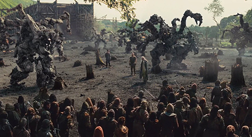 But no this film goes always, always, always for the big spectacle. Not that this always work: Yates doesn’t shoot the battle hugely well. Aside from one excellent sequence which shows our three heroes trying to get across the castle courtyard, while chaos rages around them (beautifully scored as well), the battle is unclear, dingy and not hugely exciting. Again, I’d have liked to have had a bit more of this – to get some moments with this huge cast doing stuff in the battle (especially since they are ALL back – kudos to the producers there).